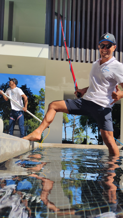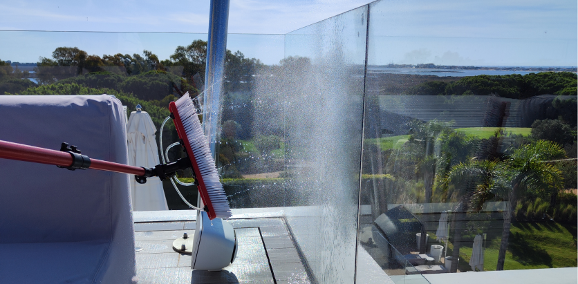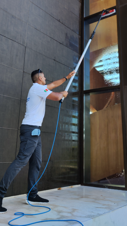 Sistema de Água purificada (WFP) – é sistema moderno que evita resíduos minerais e não deixa marcas nos vidros.A limpeza é feita com a utilização de bastões com alcance em altura operações segura de até ~20m metros a partir do chão, dispensando escadas na maioria dos casos.